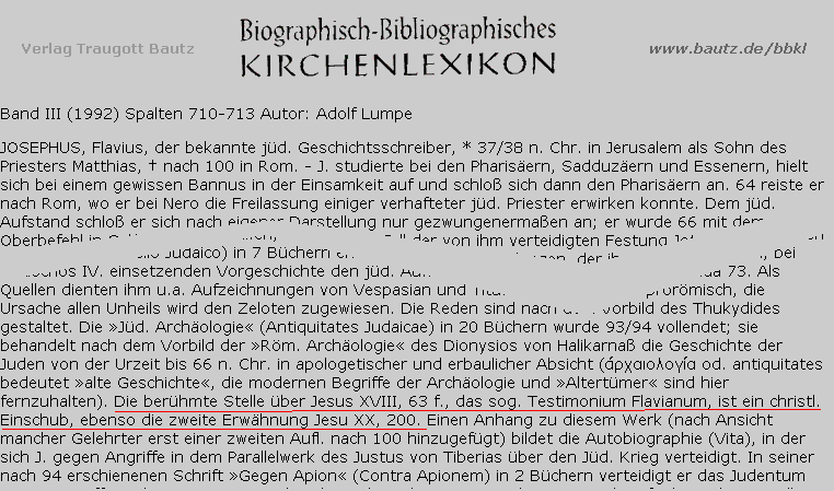 Ο Ιώσηπος Φλάβιος (Josephus Flavius, 37-100 μ.Χ.), στρατιωτικός και ιστορικός με αριστοκρατική καταγωγή και θρησκευτική μόρφωση, έζησε στην Παλαιστίνη και αιχμαλωτίστηκε (67 μ.Χ.) από τους Ρωμαίους στον ιουδαϊκό πόλεμο που κατέληξε στην καταστροφή της Ιερουσαλήμ (70 μ.Χ.) Στα βιβλία του «Πόλεμος των Ιουδαίων» και «Ιουδαϊκές Αρχαιότητες» περιγράφει ο Ιώσηπος με λεπτομέρειες διάφορα περιστατικά από την απώτερη και πρόσφατη ιστορία του λαού του, αναφέρεται σε διάφορες εβραϊκές αιρέσεις κτλ., δεν κάνει όμως καμιά αναφορά σε χριστιανούς. Απρόσμενα και εκτός συμφραζομένων περιγράφει όμως ο Ιώσηπος, σε κάποιο σημείο των «Ιουδαϊκών Αρχαιοτήτων», μάλλον επαινετικά, τη δραστηριότητα και τα θαύματα του Ιησού, τον οποίο αποκαλεί «μεσσία».